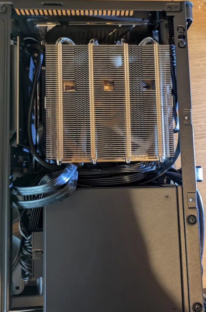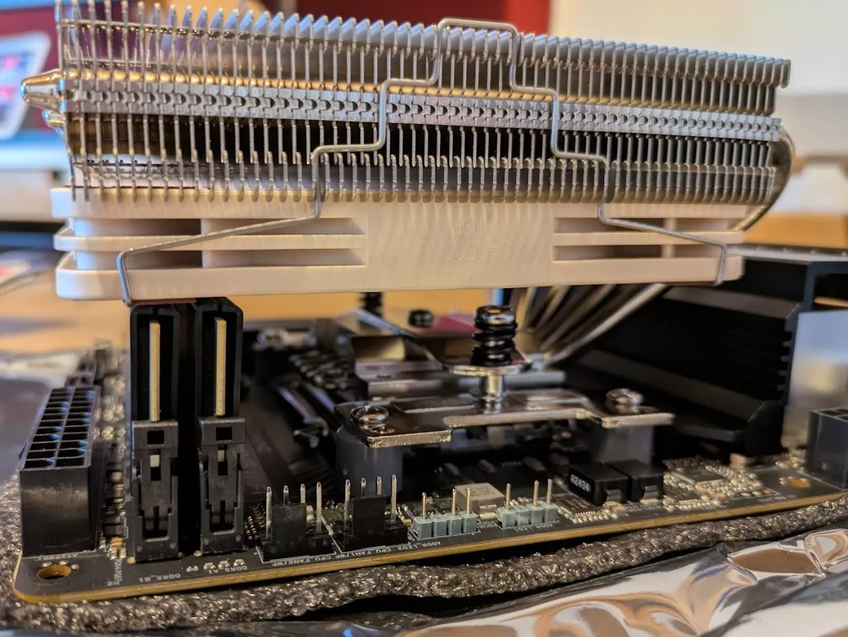 - Carefully place the Noctua NH-L12S (with the fan attached in low profile mode) on the mounting hardware/CPU. Do not forget to put cooling paste on the CPU!