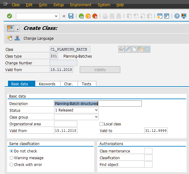 Once you’ve completed these steps, you should be able to create a class for your class type using transaction CL02 and classify objects with transaction CL20N: